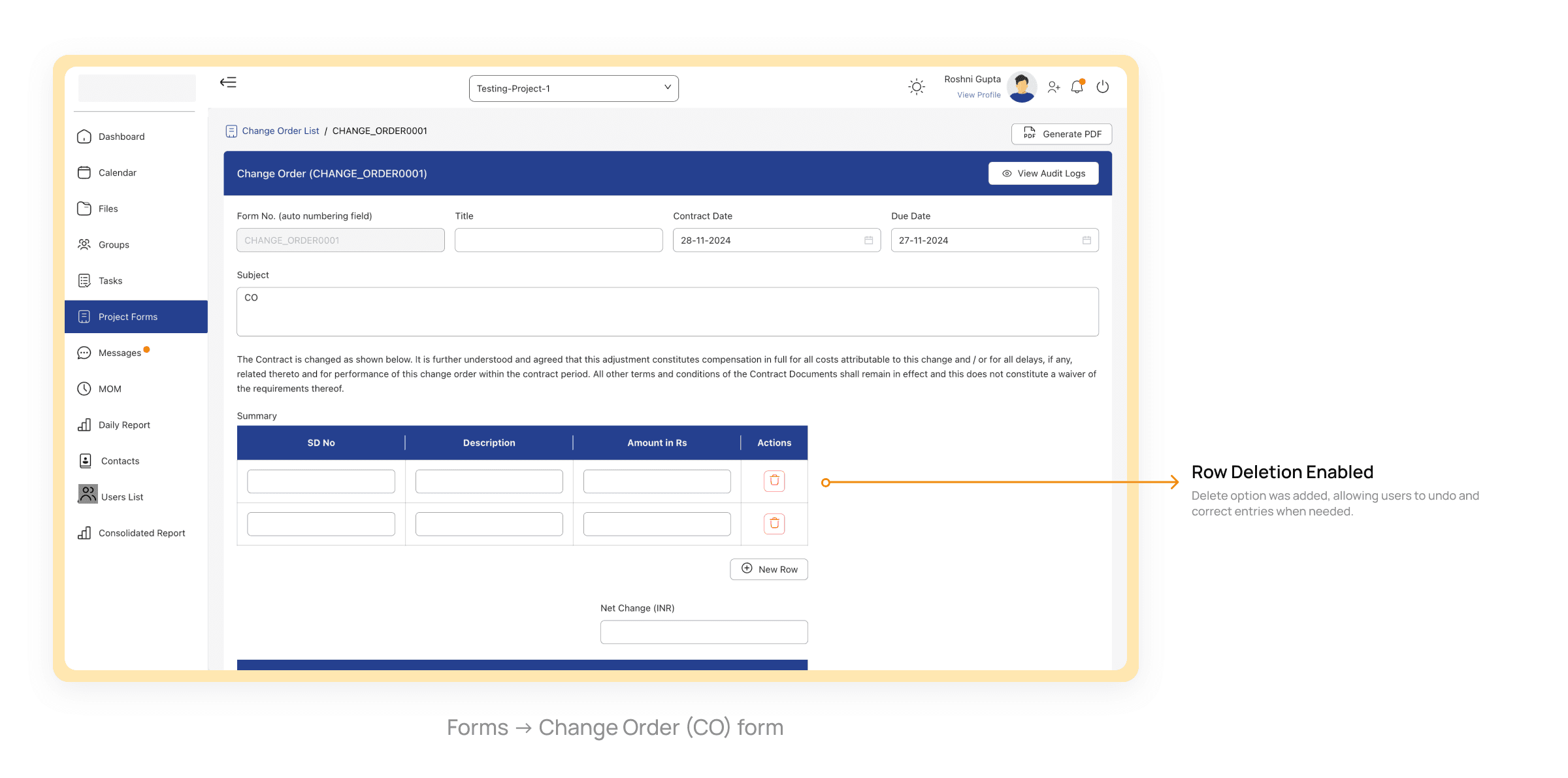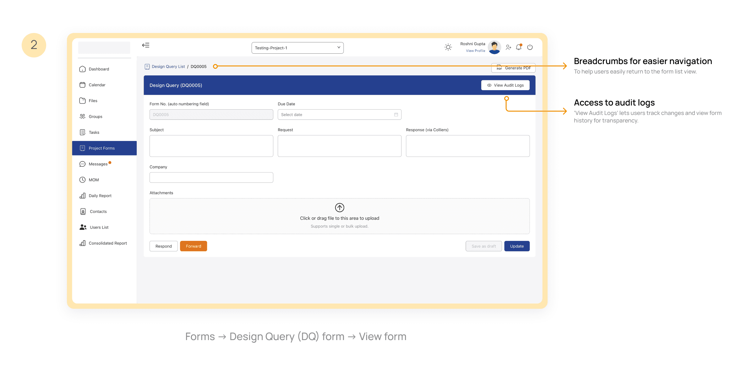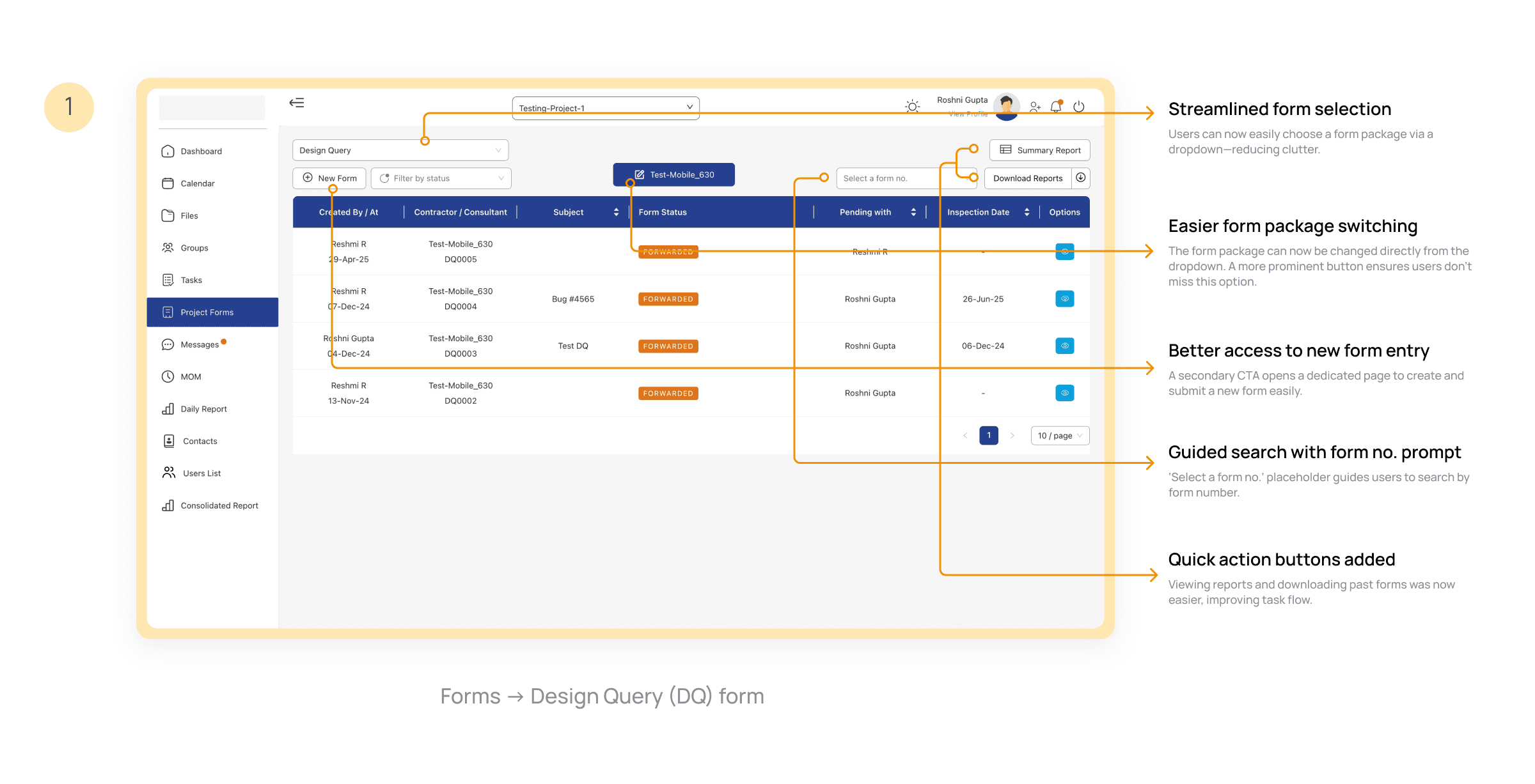 Adding placeholder text like “Select a form no.” in the search bar guided users more effectively and reduced input errors during form searches.