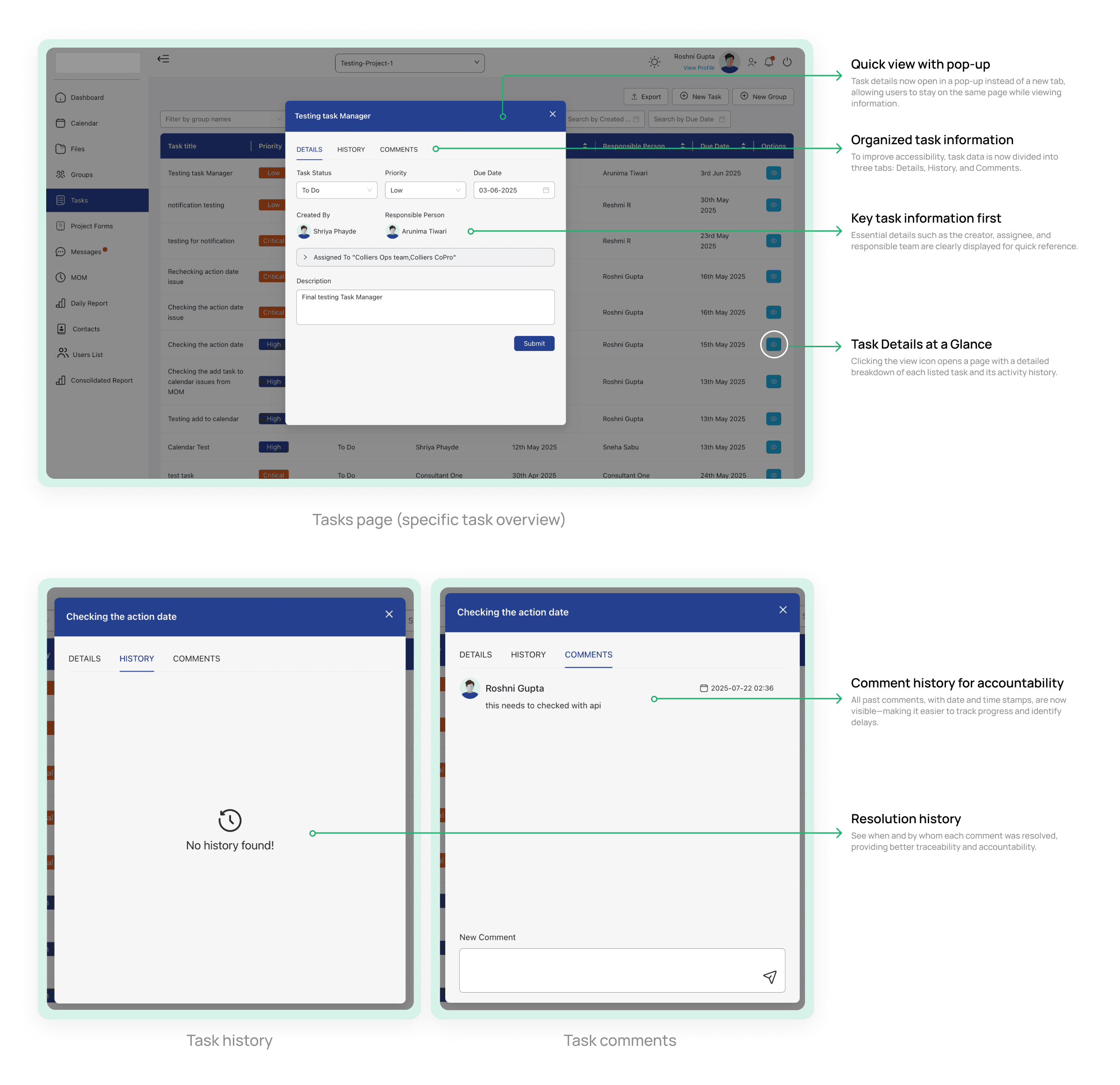 Participants found the pop-up task view and comment resolution history helpful for staying on the same page and tracking who did what, reducing confusion in team handoffs.