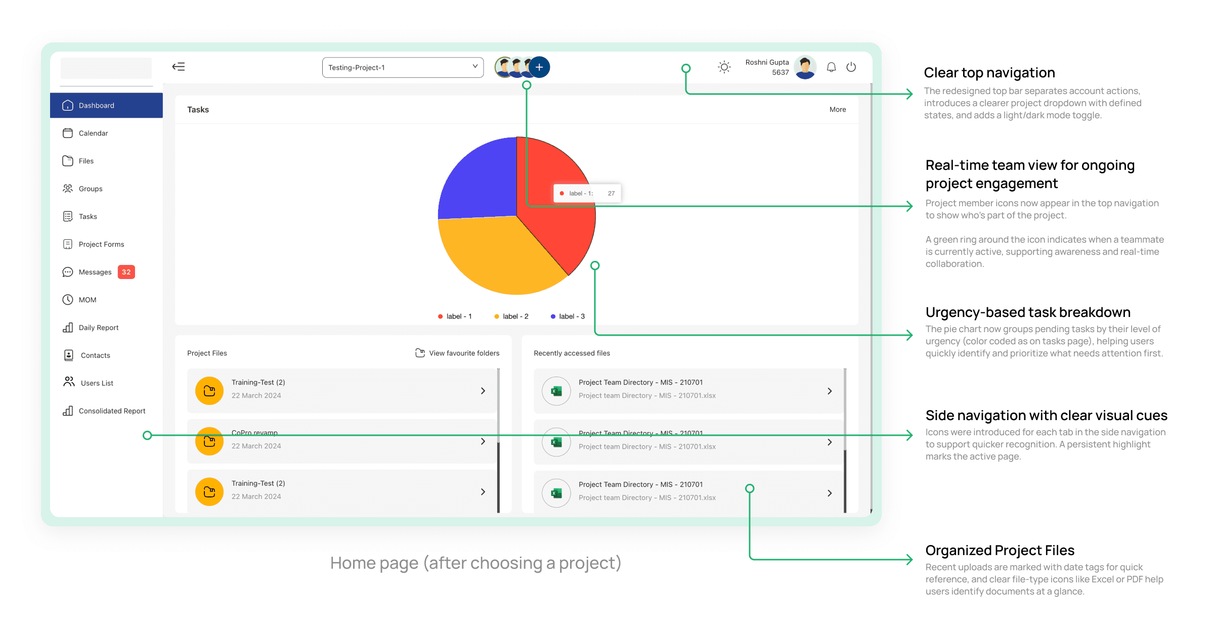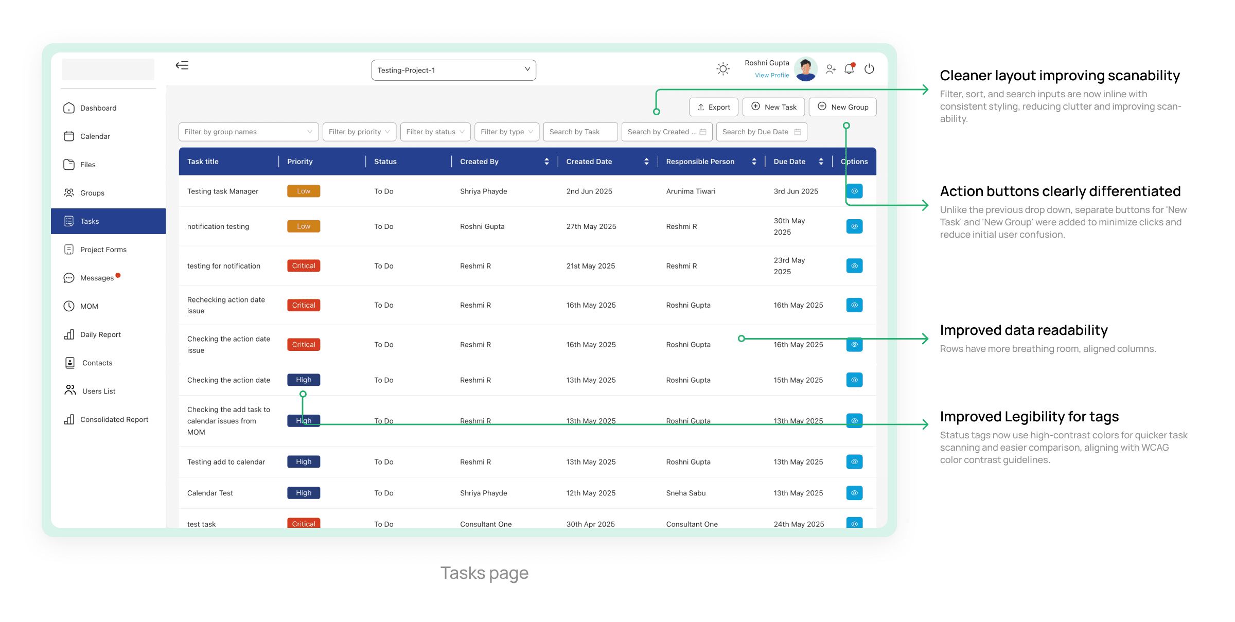 High-contrast status tags and consistent UI styling enhanced legibility, especially for scanning tasks and identifying statuses at a glance.