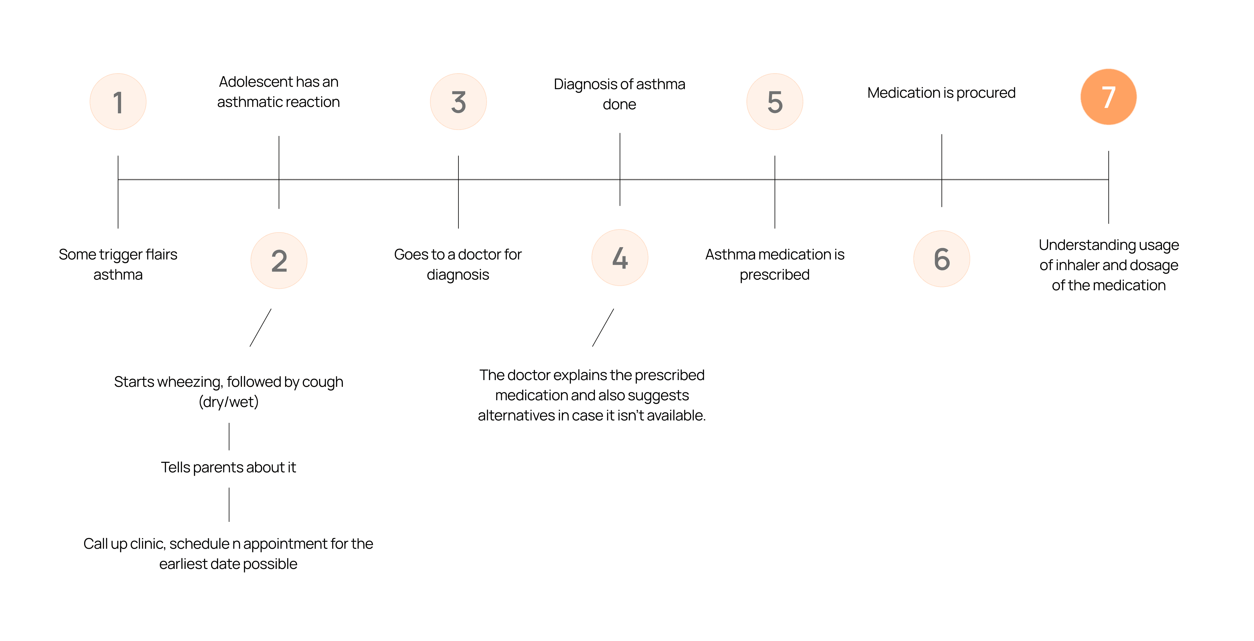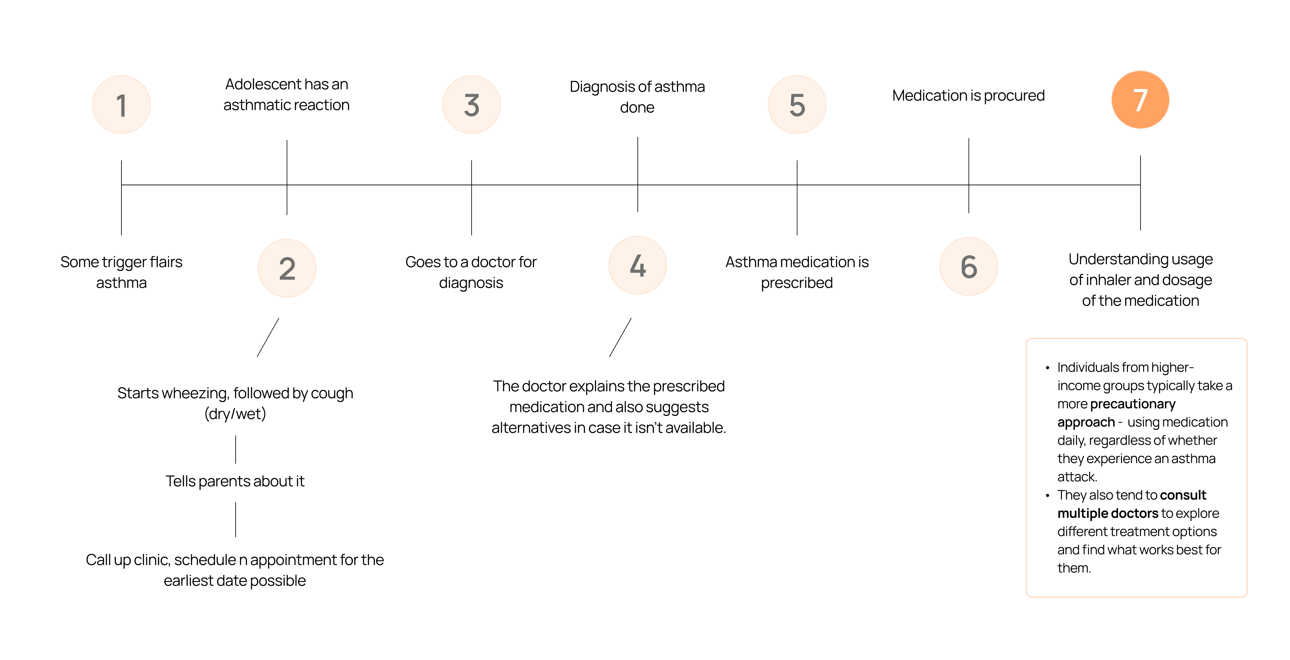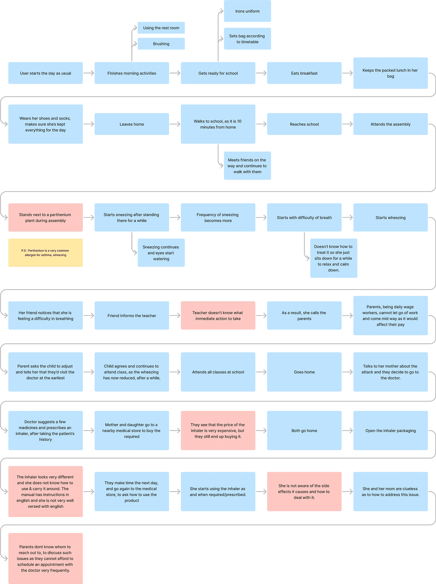 At this stage, we synthesized insights from interviews, habitat studies, and focus groups to map a typical day in the life of an adolescent asthmatic from a lower-middle-class family.