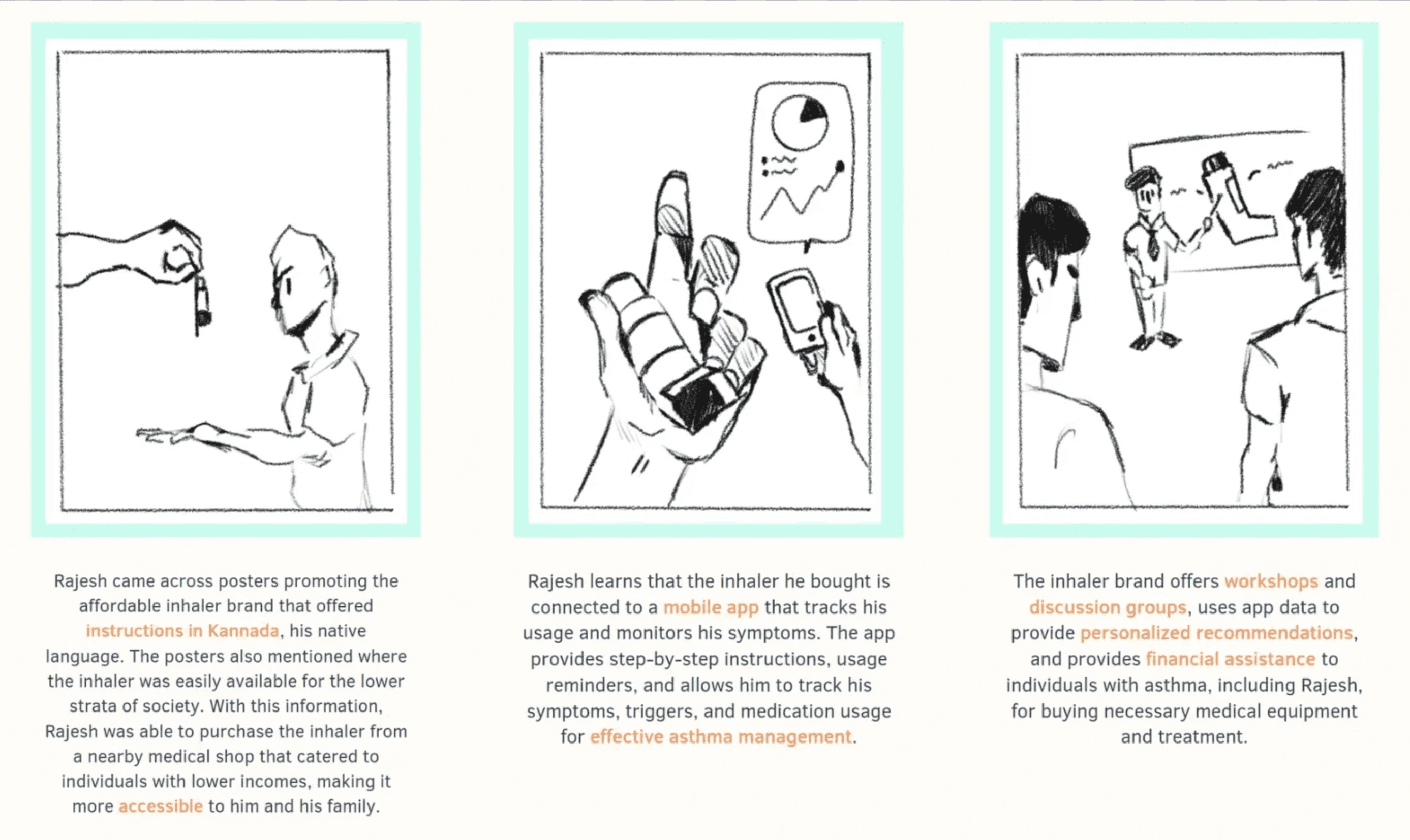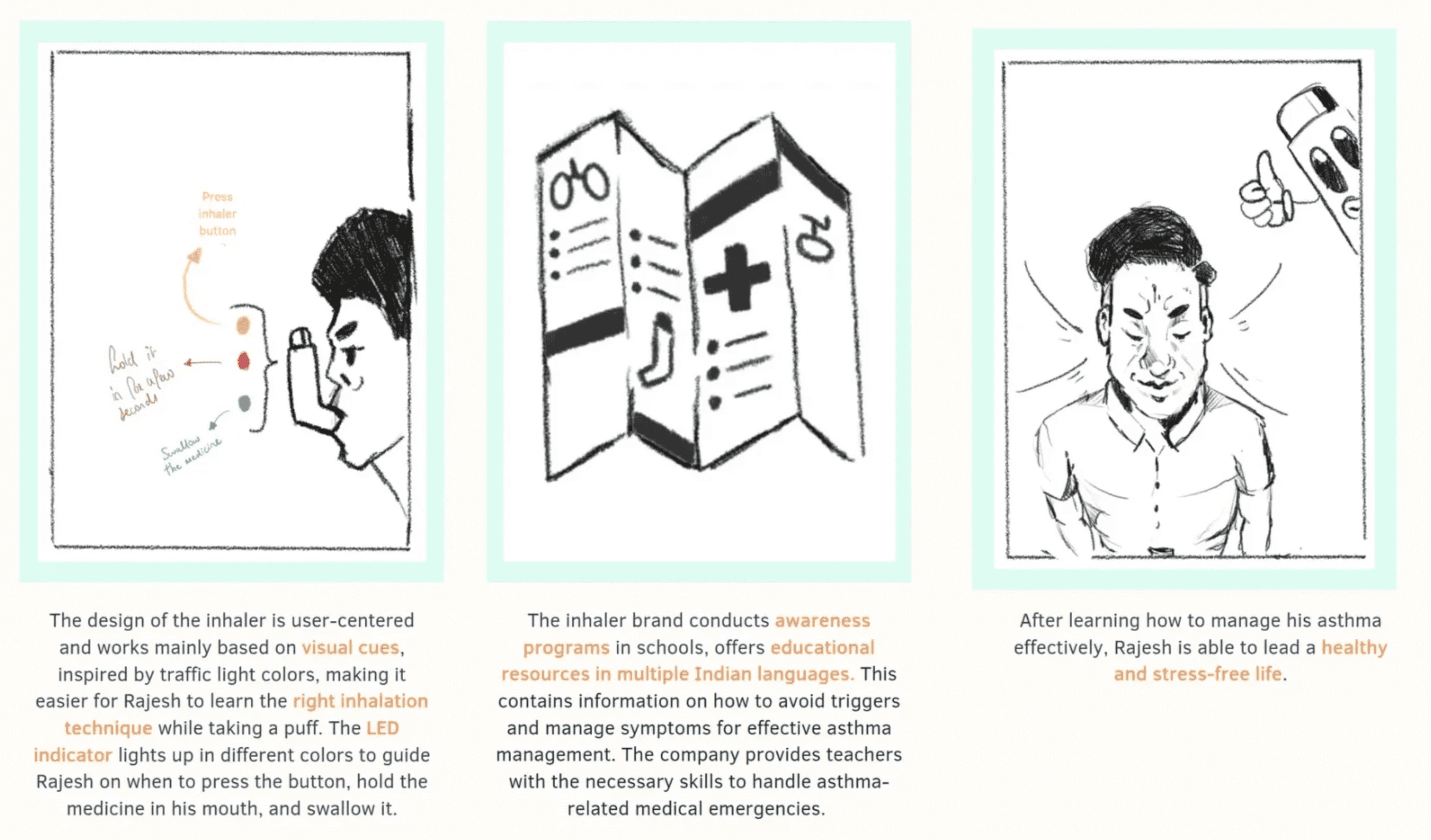 While users often turn to manuals when using a product for the first time, asthma patients from India’s lower middle class often face challenges due to illiteracy in English. Even if they can afford the inhaler, language barriers leave them unsure of how to use it correctly.