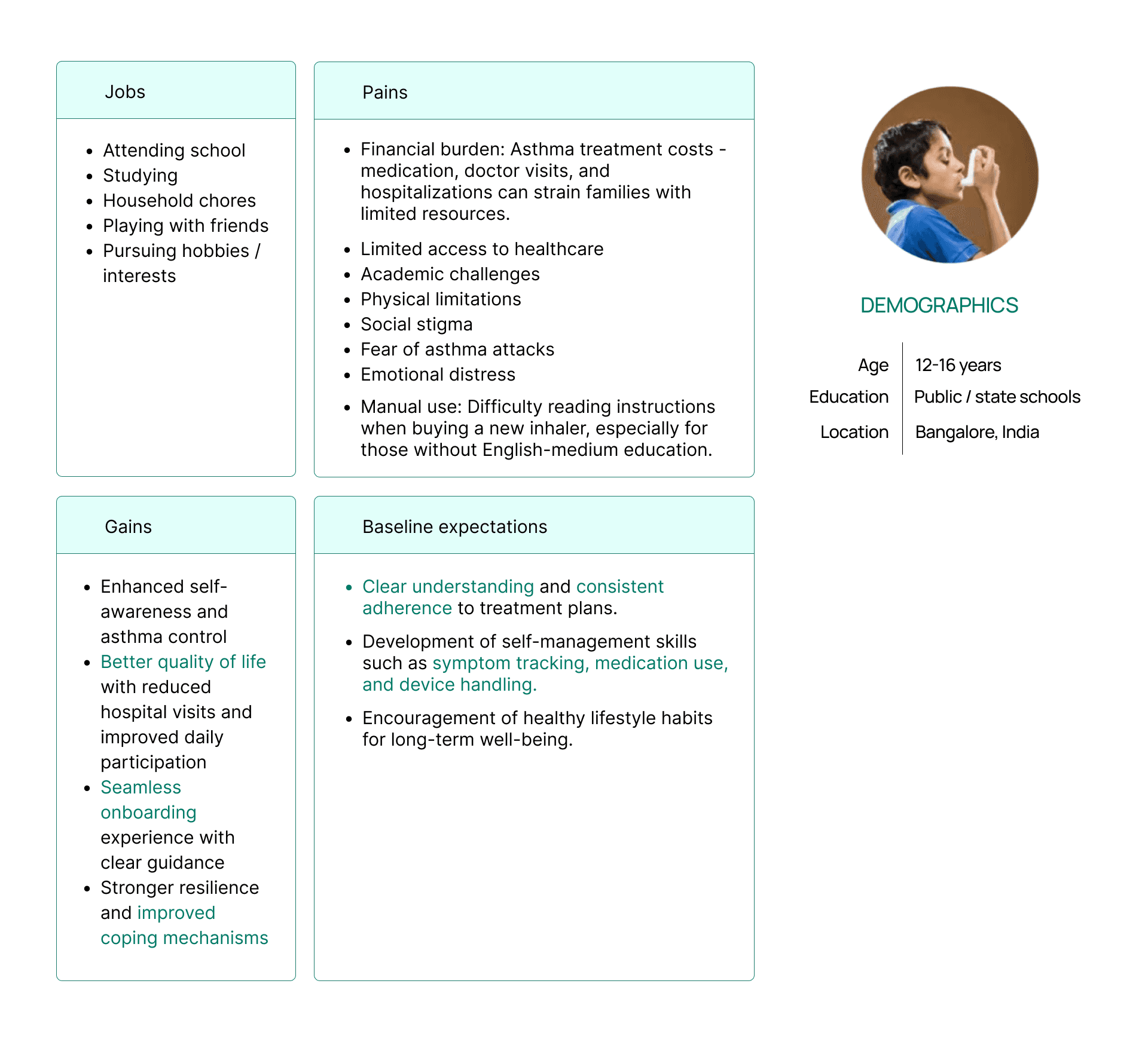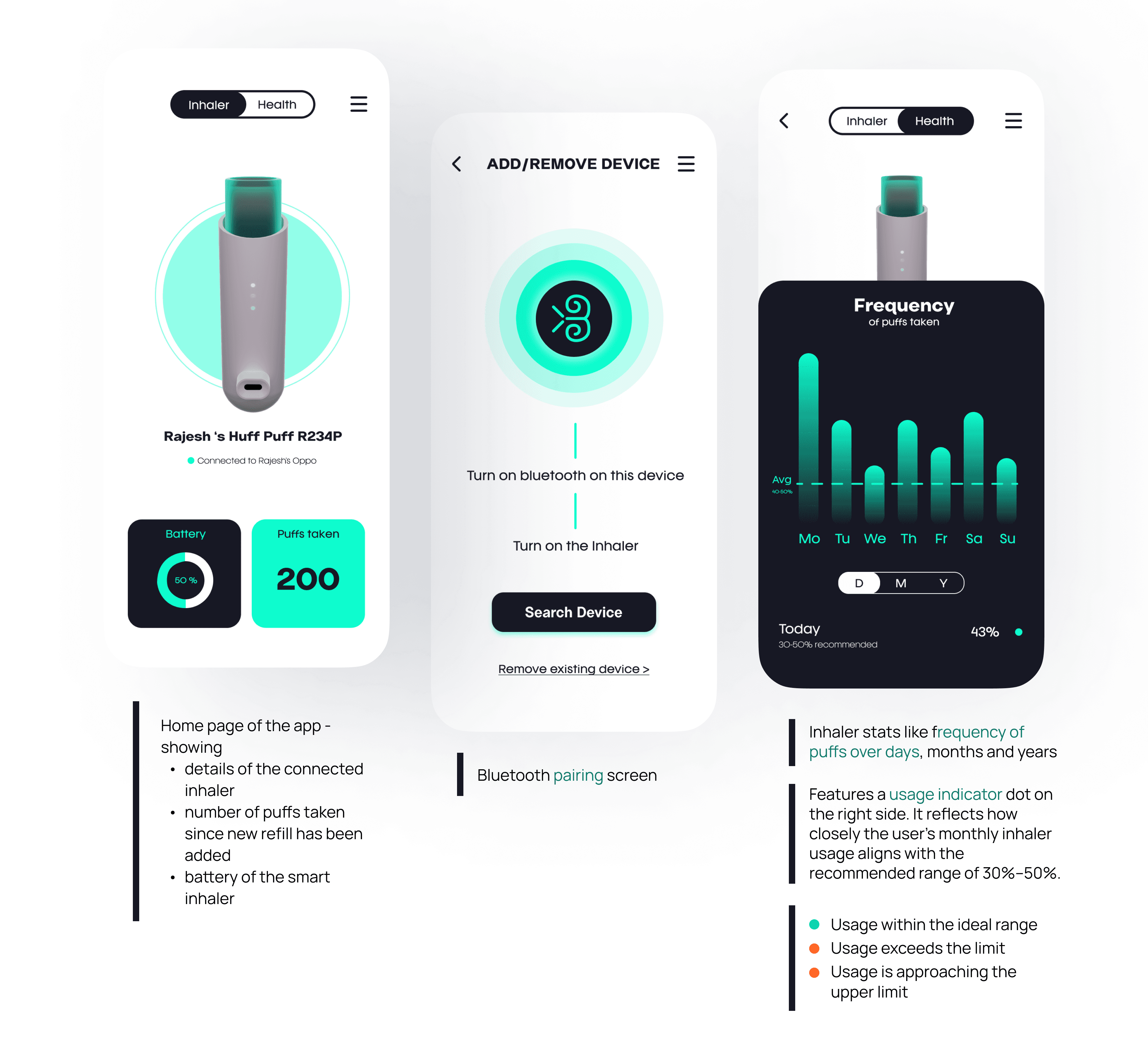 By integrating a smart inhaler, the solution streamlines asthma care through accessibility, behavior tracking, and personalized health support, ensuring better management for India’s lower-middle-class adolescents.