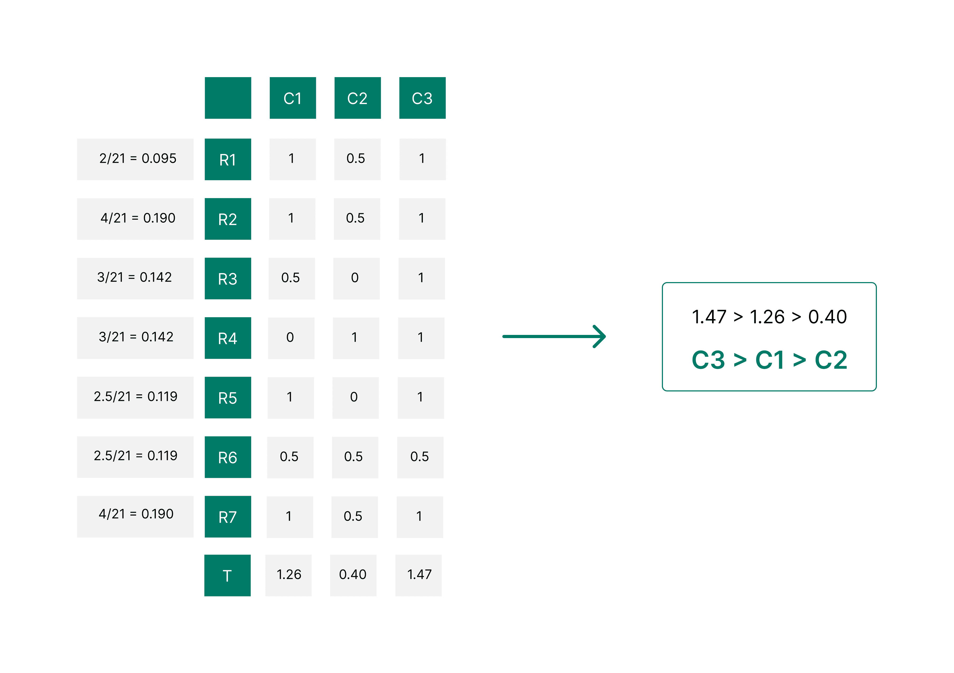 If a concept met a requirement, it was scored as 1; if it didn’t, it was scored as 0; and if it partially addressed the requirement, it received a 0.5. Each score was then multiplied by the relative importance of the corresponding requirement from the prioritization step.