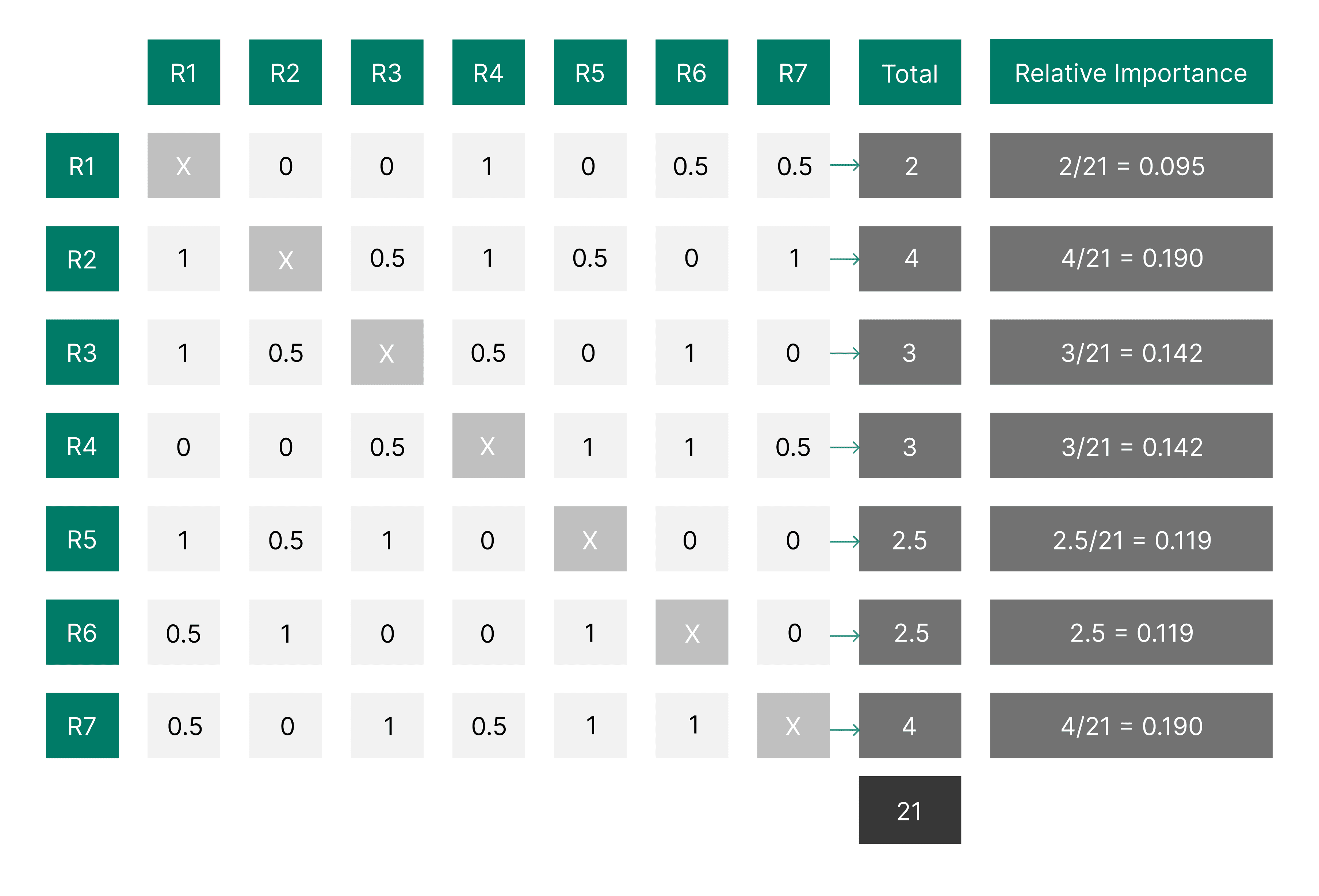 Each requirement was compared against the others to assess its relative importance. For example, when comparing R1 with each of the other eight requirements, if R1 was more important than R2 in addressing identified pain points, it was marked as 1; otherwise, it was marked as 0. The total for all requirements was then calculated (28 in this case). Finally, each requirement’s score was divided by this total to determine its relative importance, shown in the last column.